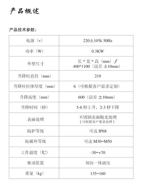 液壓升降柱主要由液壓升降柱體、氣缸、導(dǎo)向軸、封蓋、外箱、鎖等部分組成。升降體:采用304國標(biāo)不銹鋼8mm/6mm厚鋼管加工形成,具有高強(qiáng)度的承重和抗撞能力;柱體內(nèi)無電器、線路設(shè)置,防水、安全。